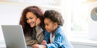 Two grandparents cuddle their granddaughter who is looking at a computer during a virtual doctor's visit