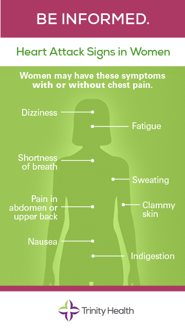 For Women: Women may experience different symptoms than men. These include pain in the back, arm, neck, or shoulder; nausea; fatigue; shortness of breath; and vomiting.
